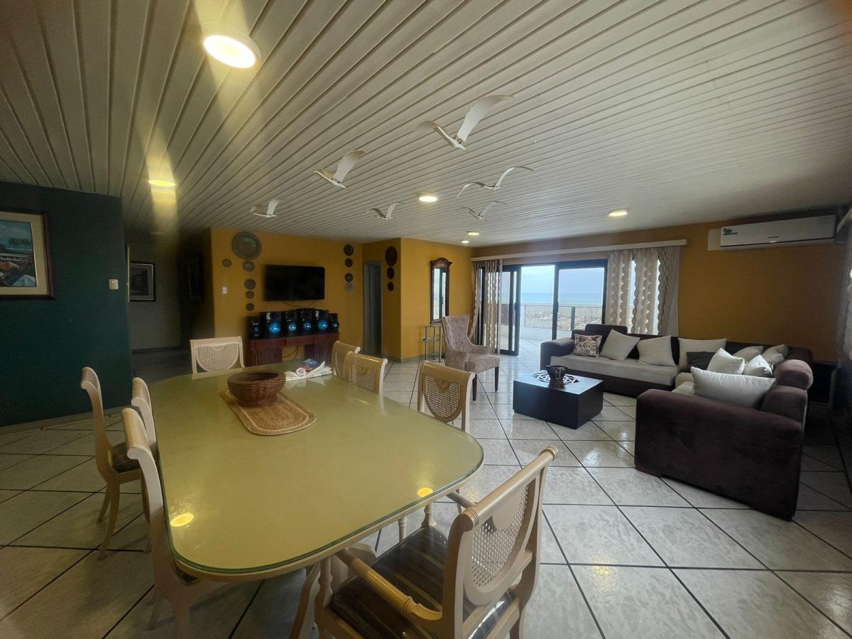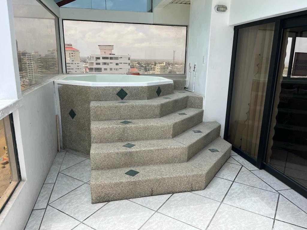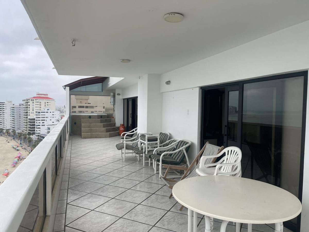 Se vende Penthouse amoblado ubicado en el edificio Vista del mar, en el Malecón de Salinas, El departamento está comprendido en el último piso del edificio, es decir en la 12va planta alta, con las mejores vistas 360 de toda la península, ya que se compone por 7 dormitorios cada uno con baño, aire acondicionado y con una excelente vista a un determinado punto del mar, además posee espacios de sala y comedor amplios en un solo ambiente, con una conexión directa al àrea de cocina, cuarto de maquinas y lavanderia, de esta manera cuenta con una distribución propicia con acceso a una terraza espaciosa que se compone por un área social y un jacuzzi grande con calefones nuevos y bombas en perfecto estado, todo esto emplazado en un àrea de 326m2, además posee un àrea de parqueo independiente ideal para 4 vehiculos grandes, 1 cuarto de servicio y 2 bodegas amplias sumando a un àrea total de 408m2, la edificación cuenta con recepción y 2 ascensores, esta es tu oportunidad para invertir.