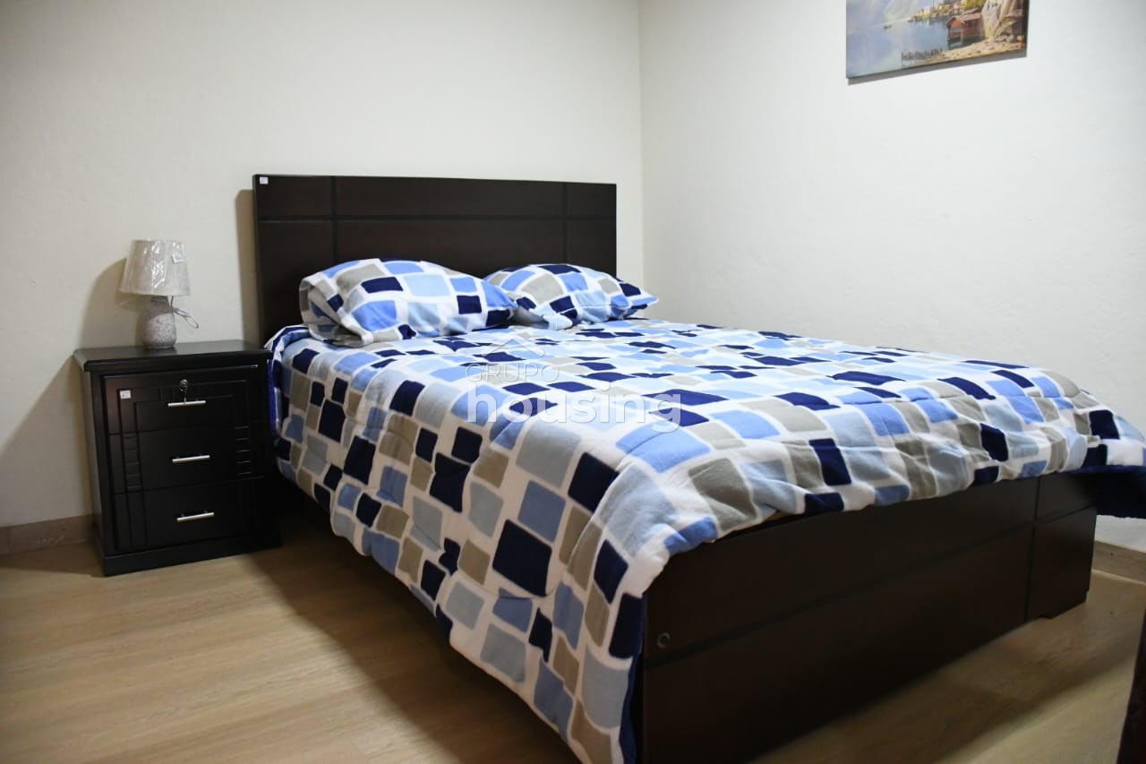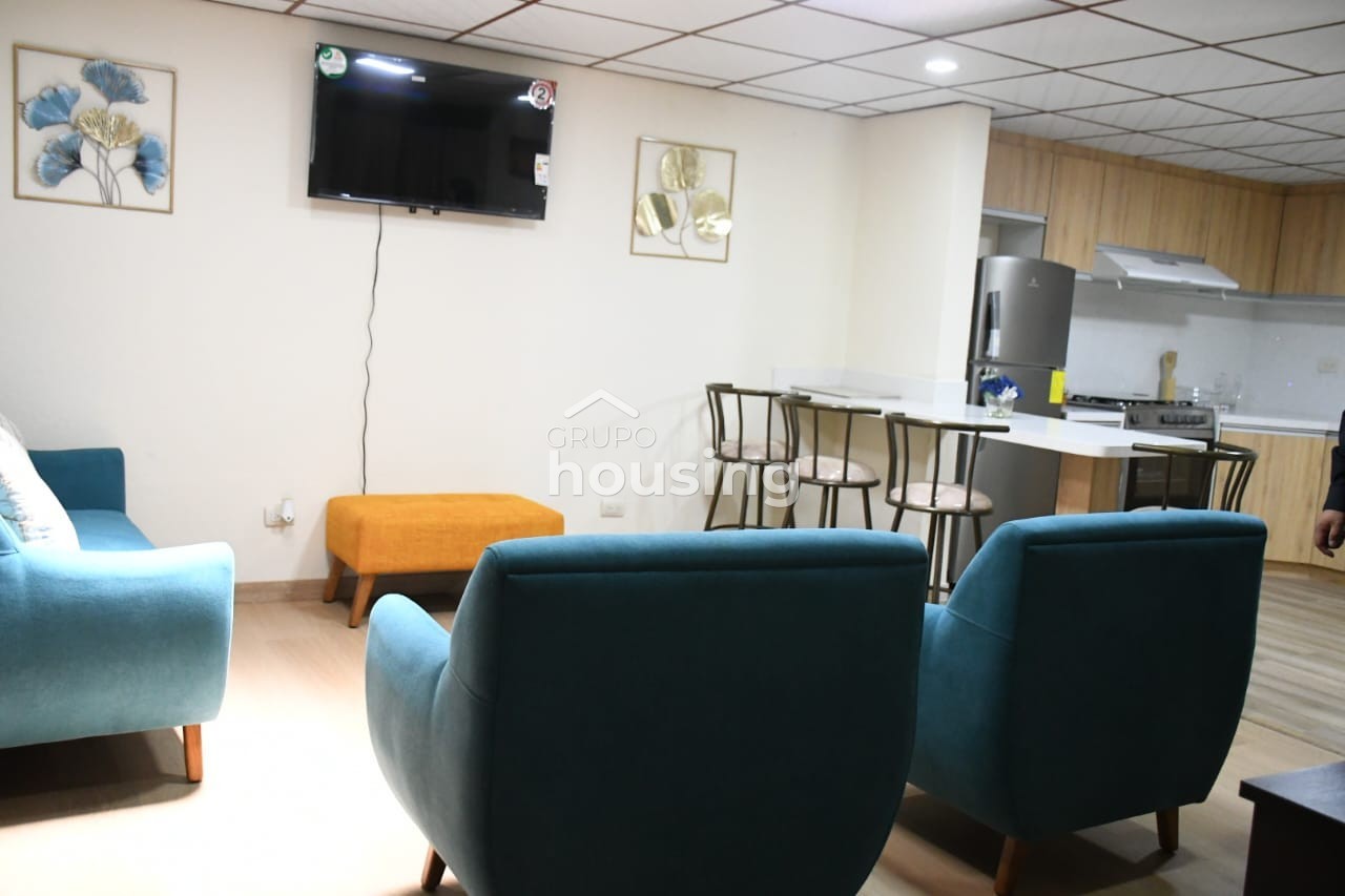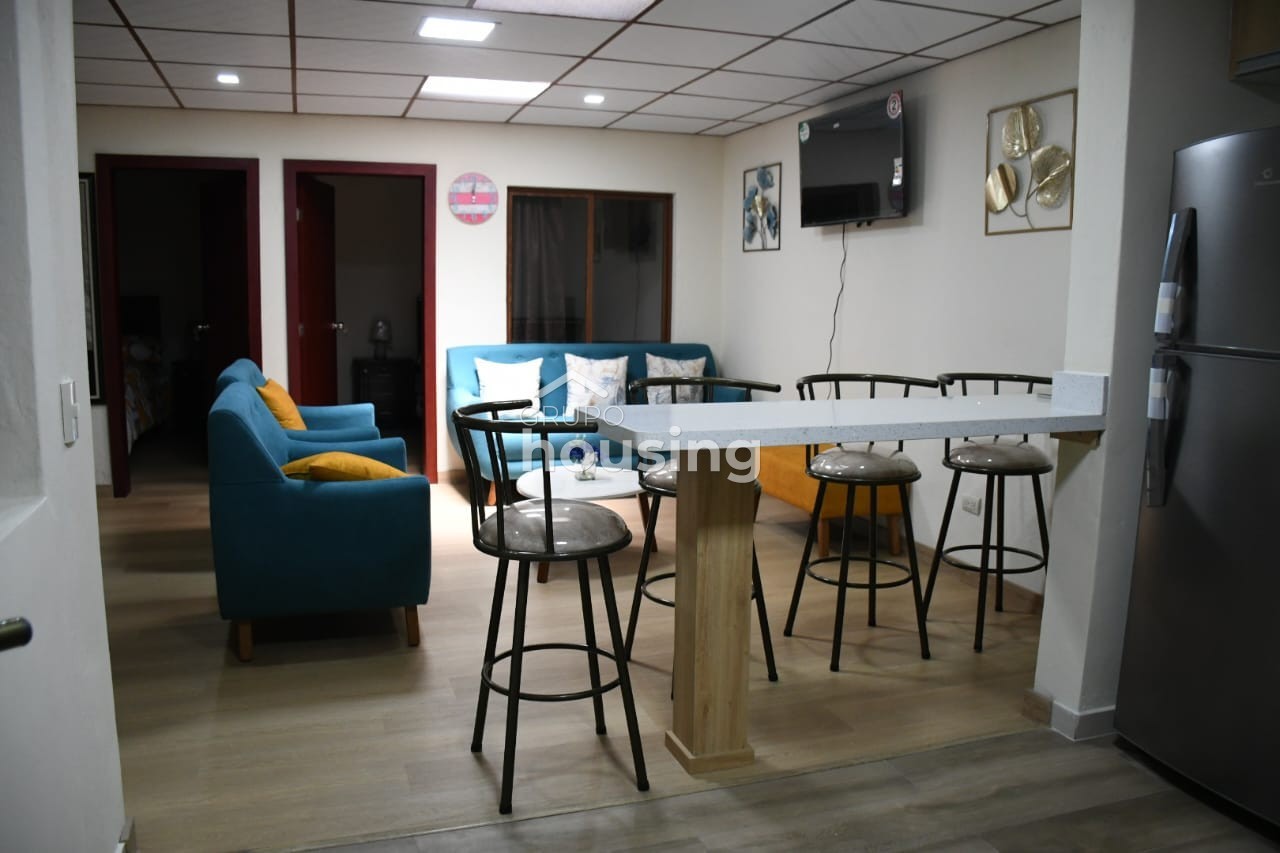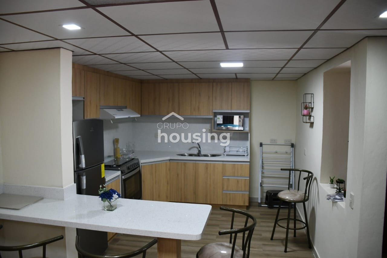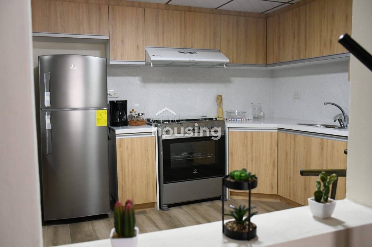 Se renta departamento amoblado a pocos metros de Unidad Educativa Las Catalinas de las Américas. Cuenta con cocina completamente equipada de electrodomésticos y lista para usar. Dispone de sala, comedor cocina, dos habitaciones, baño completo y garaje para un auto. Precio no incluye servicios basicos. No se permiten mascotas.